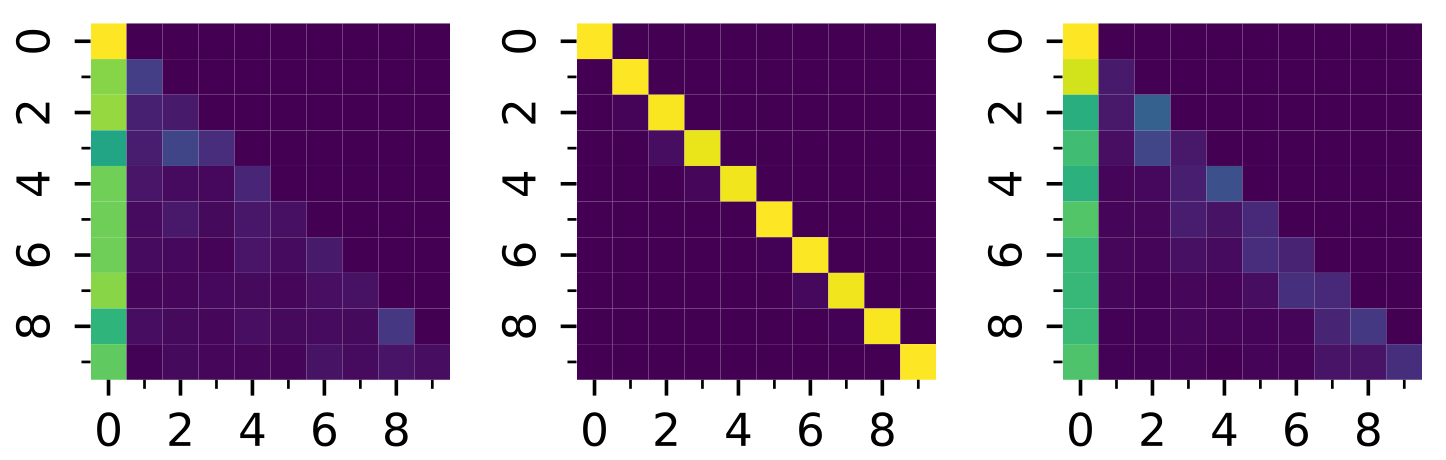 在 llama3 模型上输入 "A is B. C is D. A is" 并设置 max_new_tokens=1 (prefill) 得到以下 Attention Heatmap(部分),其中颜色由暗到亮(由紫到黄)表示激活值从小到大(0-1)。